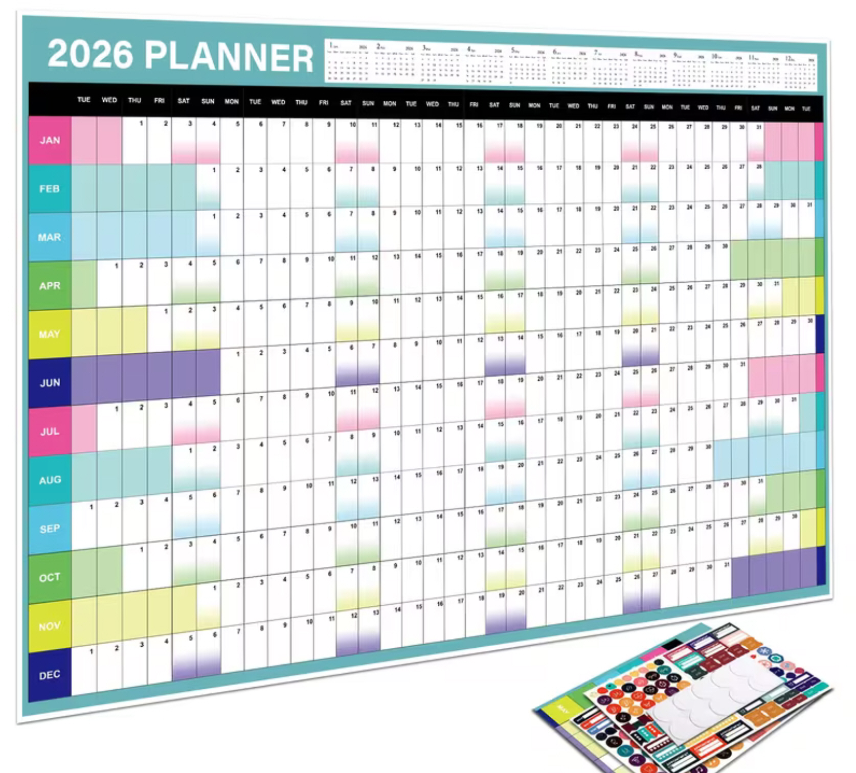 This 2026 wall calendar provides a full year view on a large 74.17 x 52.58 cm layout, making it useful for planning at home, school or in the office. It includes four sheets of stickers and ten adhesive dots for easy mounting.View Deal