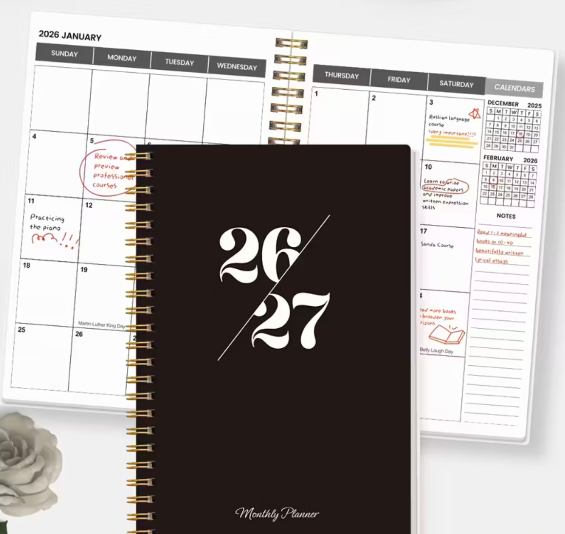 This A5 two year planner, for storing your ideas and plans, features a minimalist black and gold design with a spiral bound hardcover and a sturdy polypropylene cover. It includes monthly and weekly layouts covering 2026 and 2027, making it useful for long term scheduling, goal tracking and project planning.View Deal